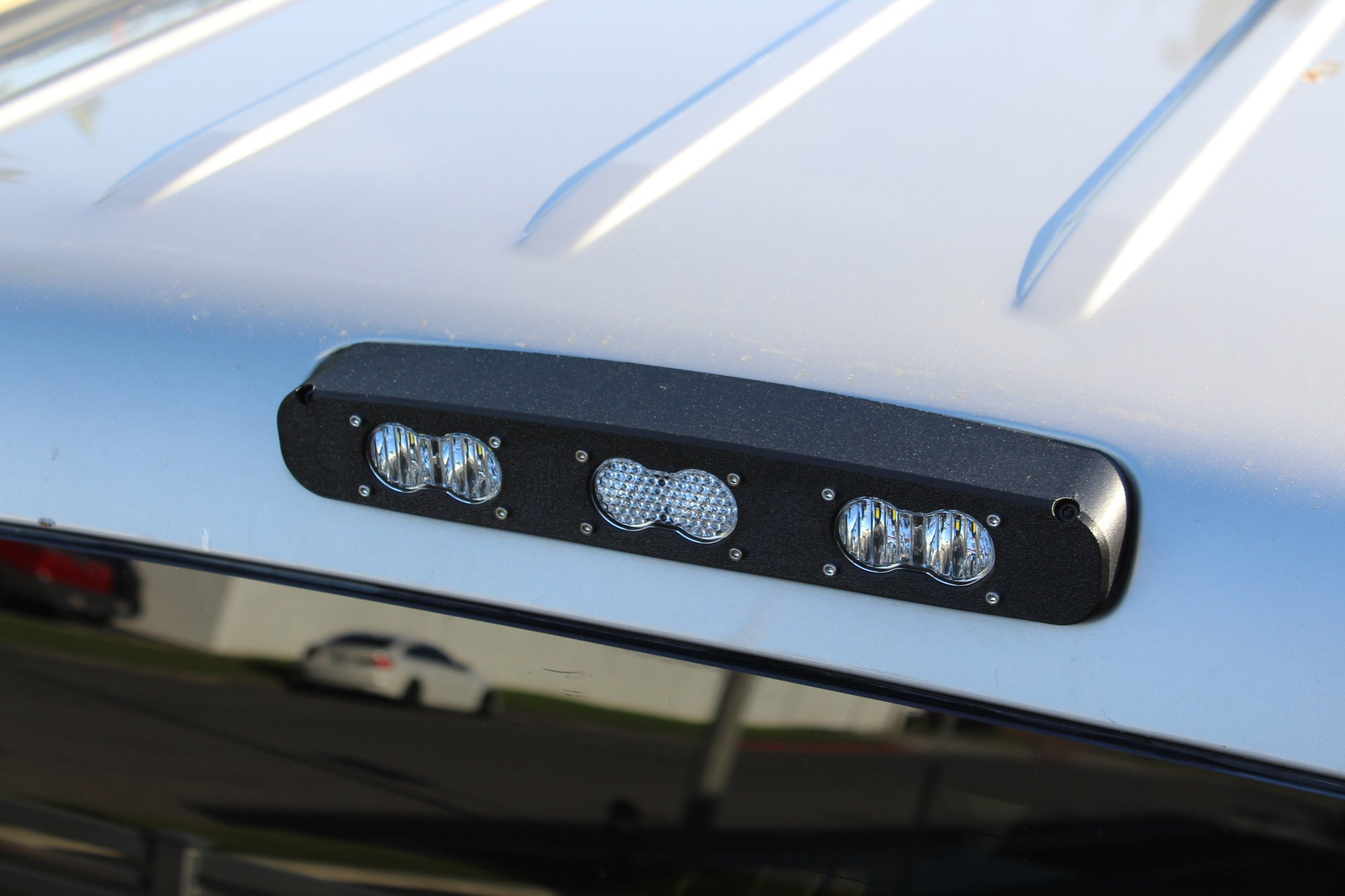 Direct bolt on dust light housing for 3 baja designs s2 that replaces the factory brake light made in the USA